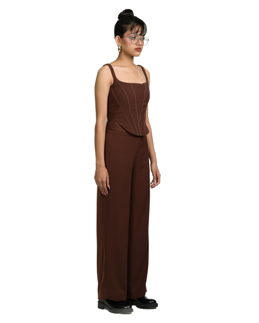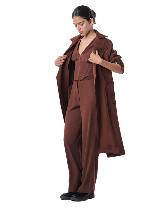 • Trench Coat With Affair Corset Paired Up With High Waisted Pants - Brown