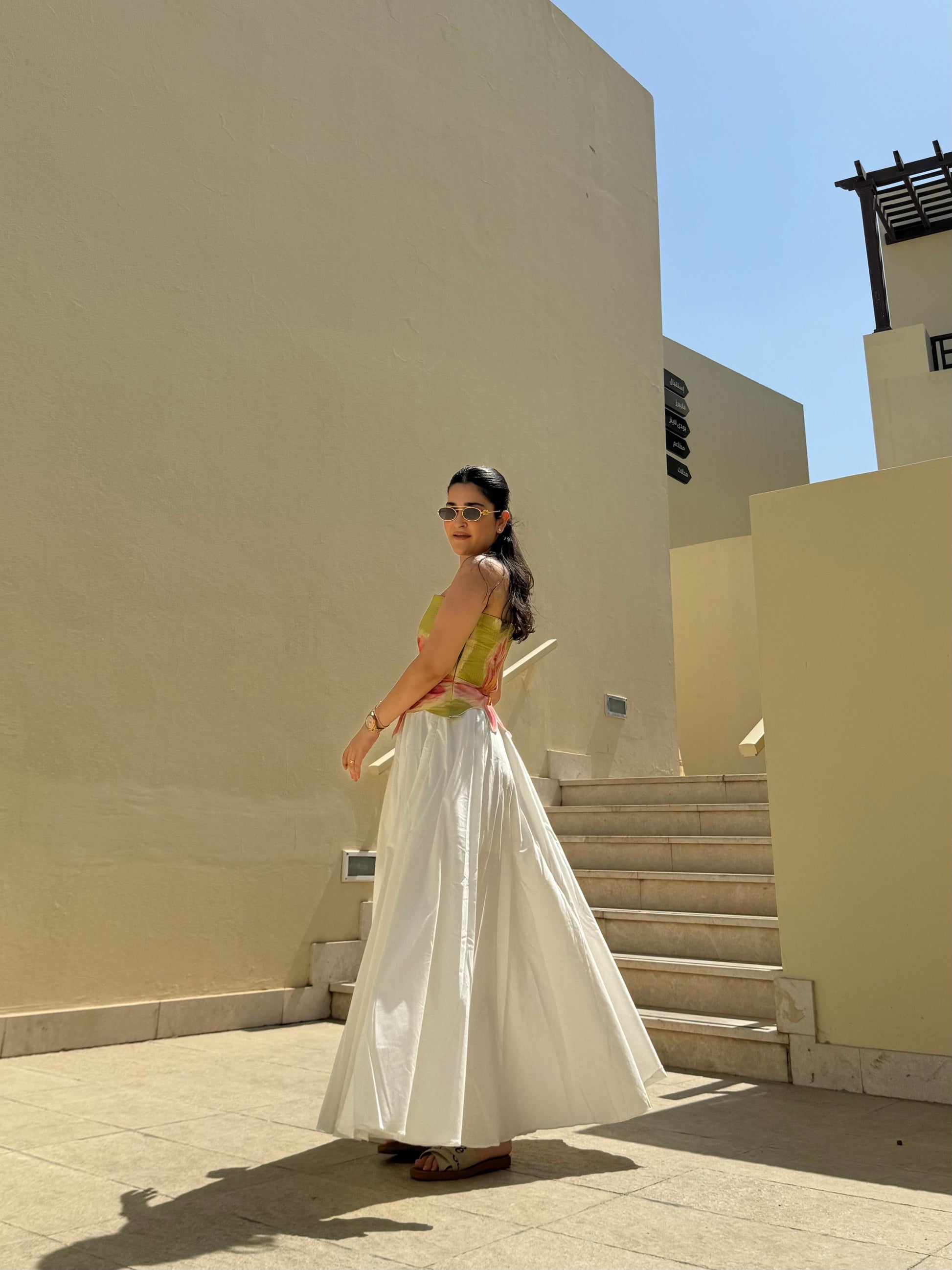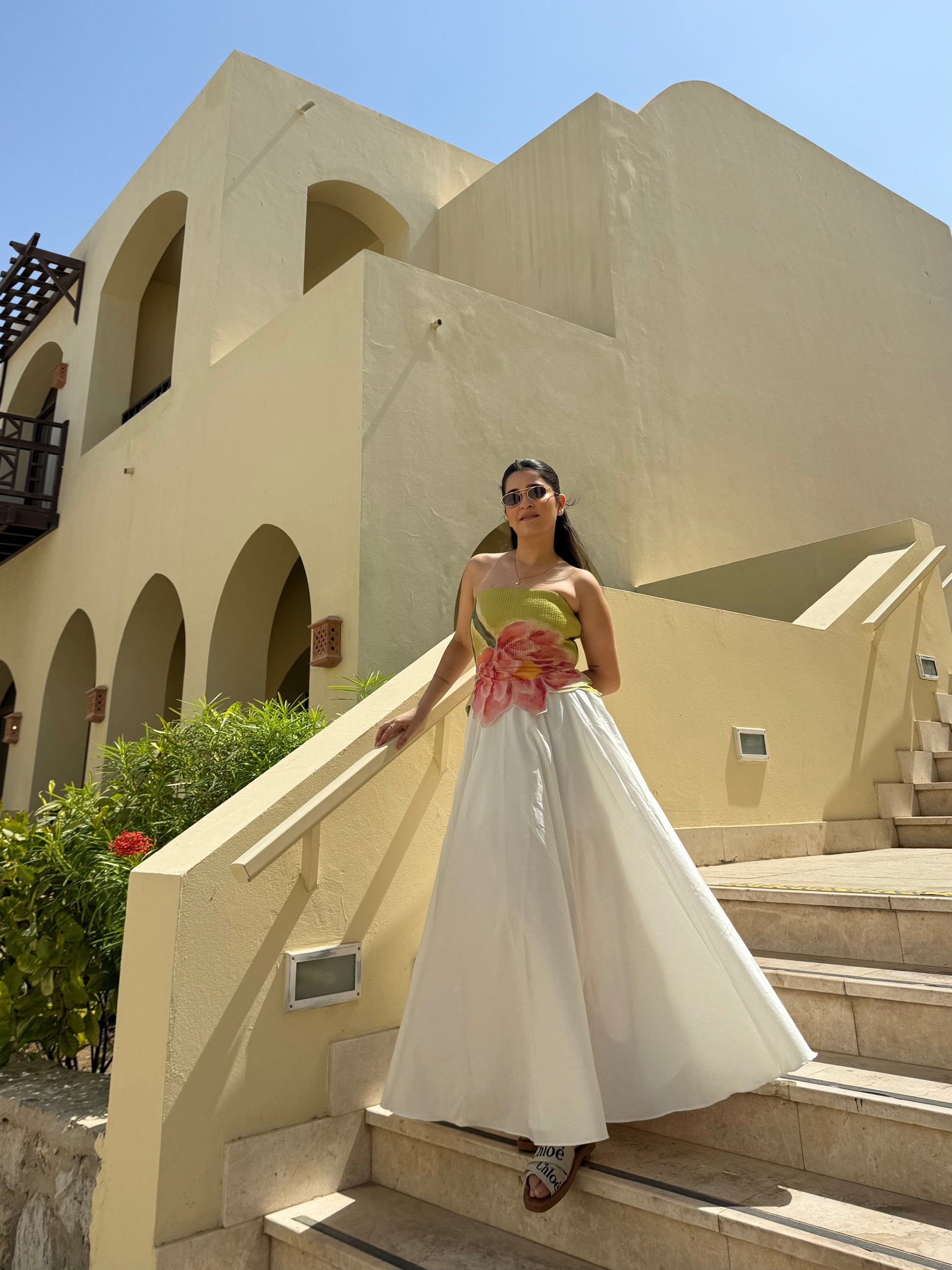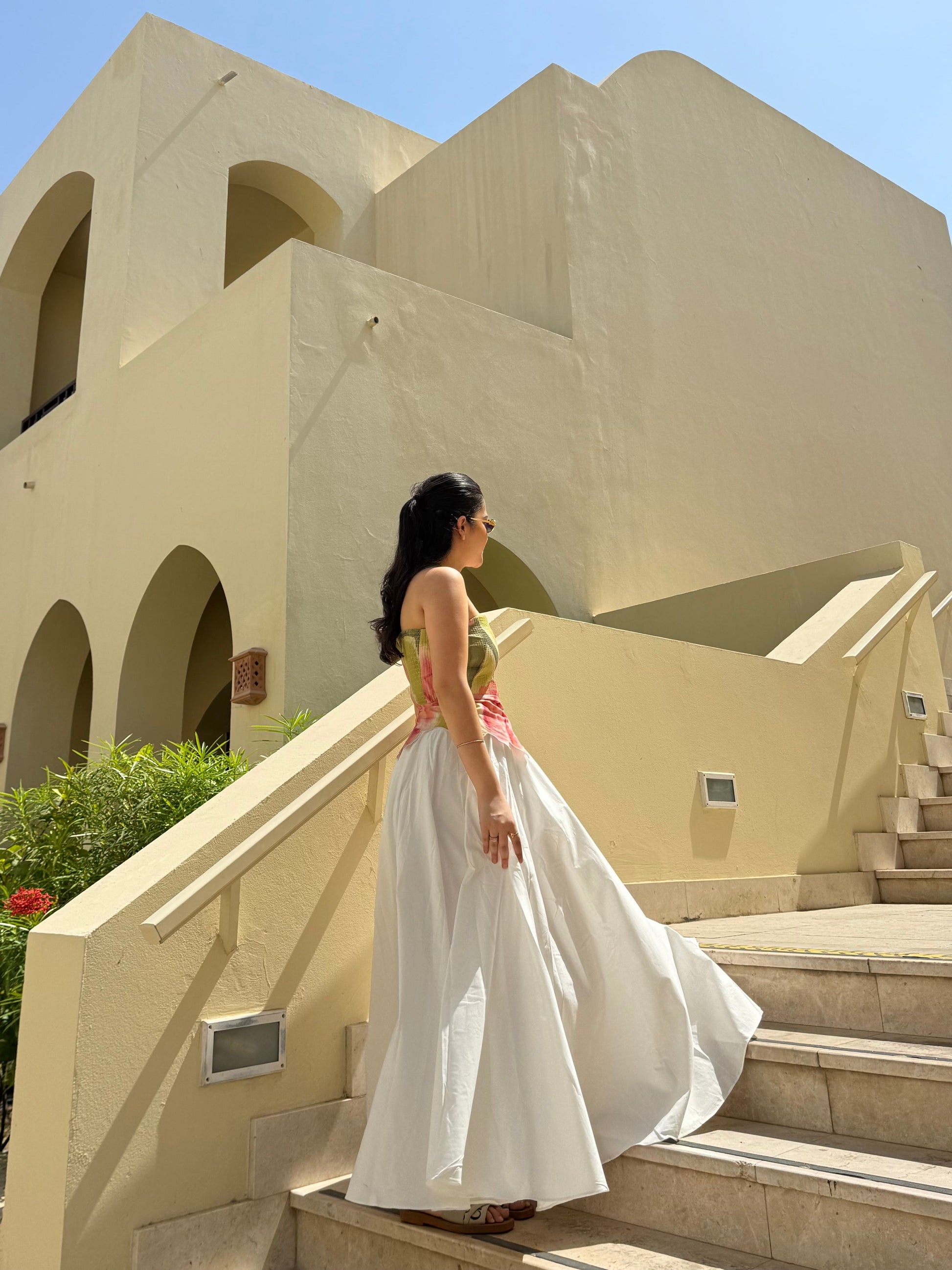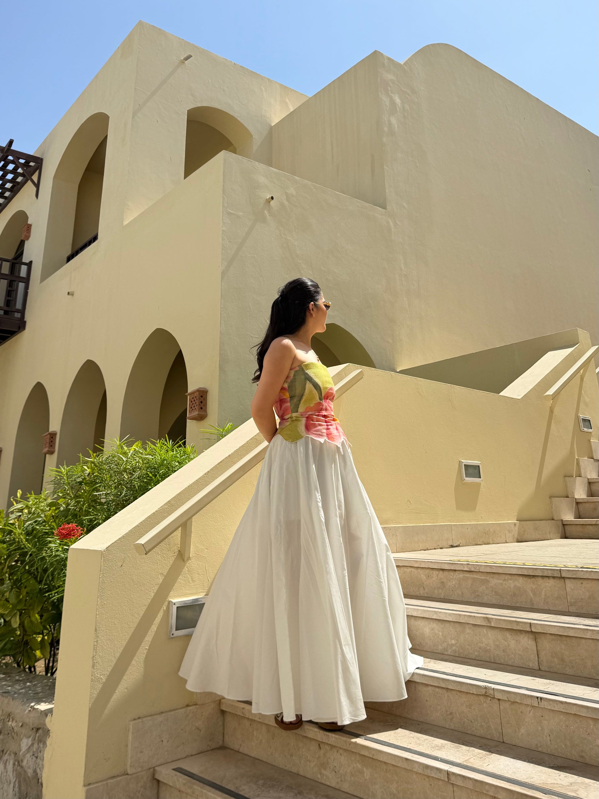 This two-piece set is all about effortless elegance with a modern twist. The corset is crafted from vibrant printed cotton, detailed with delicate cutwork at the hem for a subtle, feminine touch. Its structured shape is enhanced by stylish quilted stitching, giving you a flattering fit that holds its form beautifully. The long skirt flows with a full flare, creating a graceful silhouette that moves with every step. Together, they make a perfect combo for occasions where you want to feel confident, chic, and effortlessly put together.