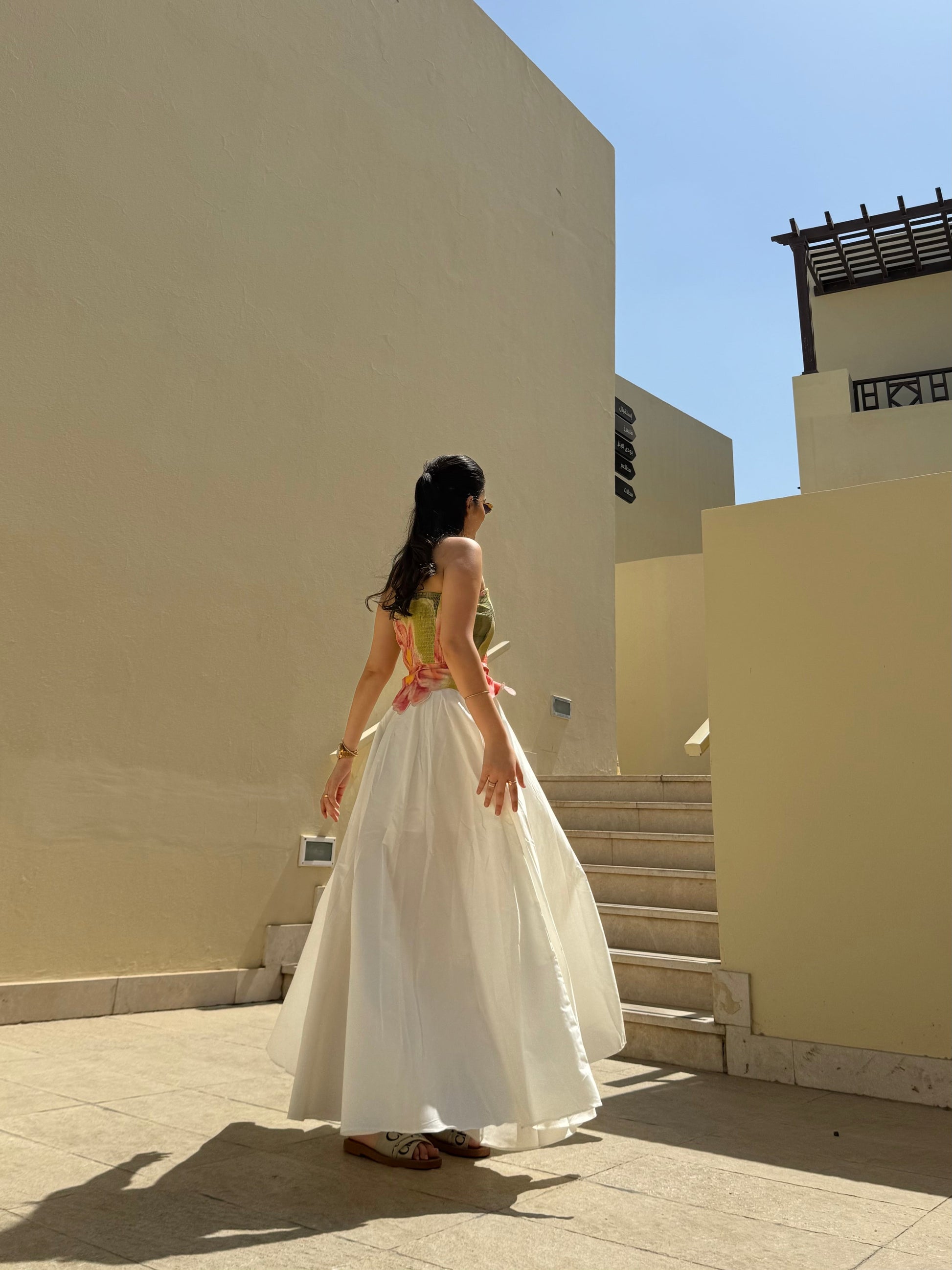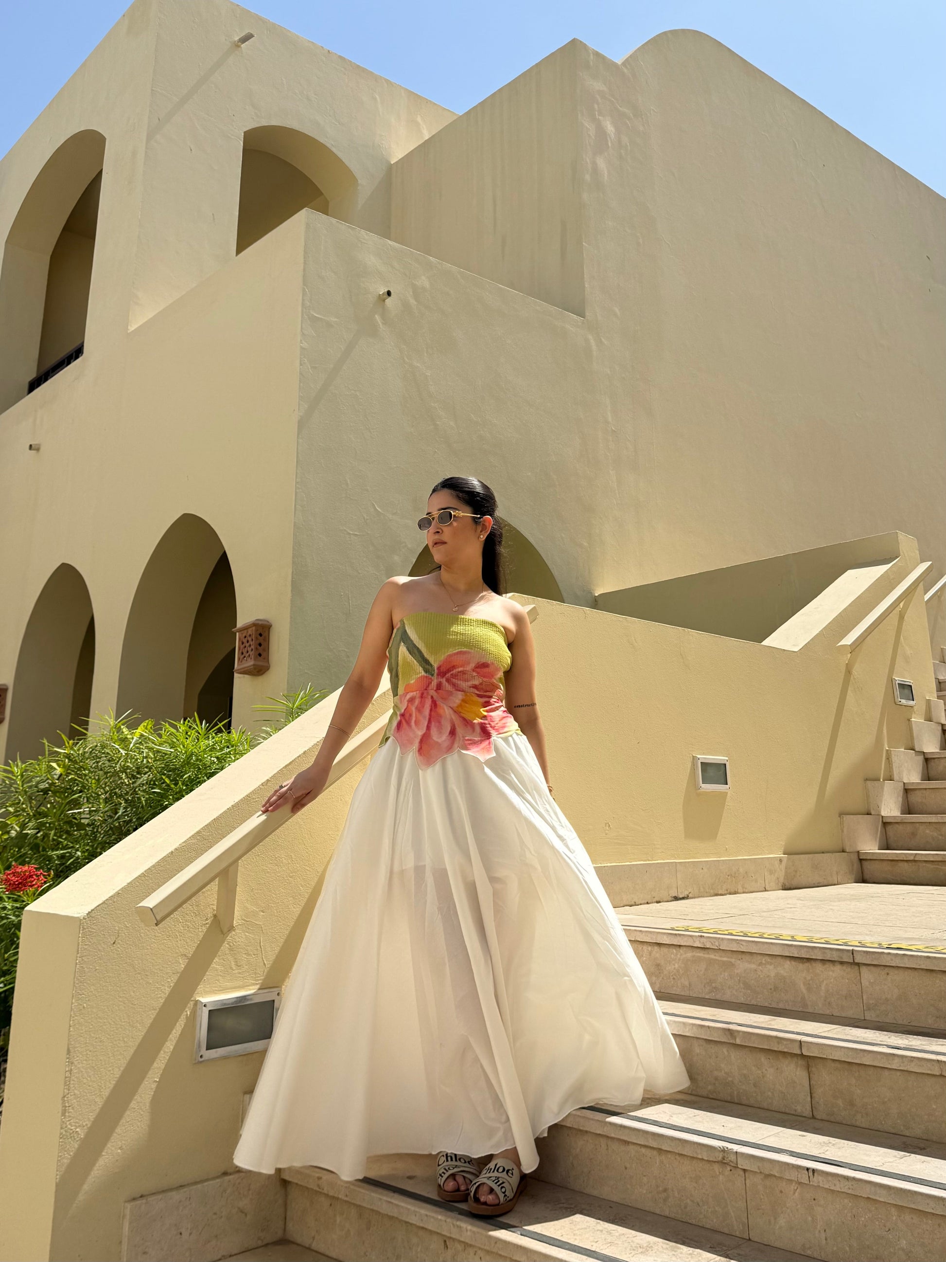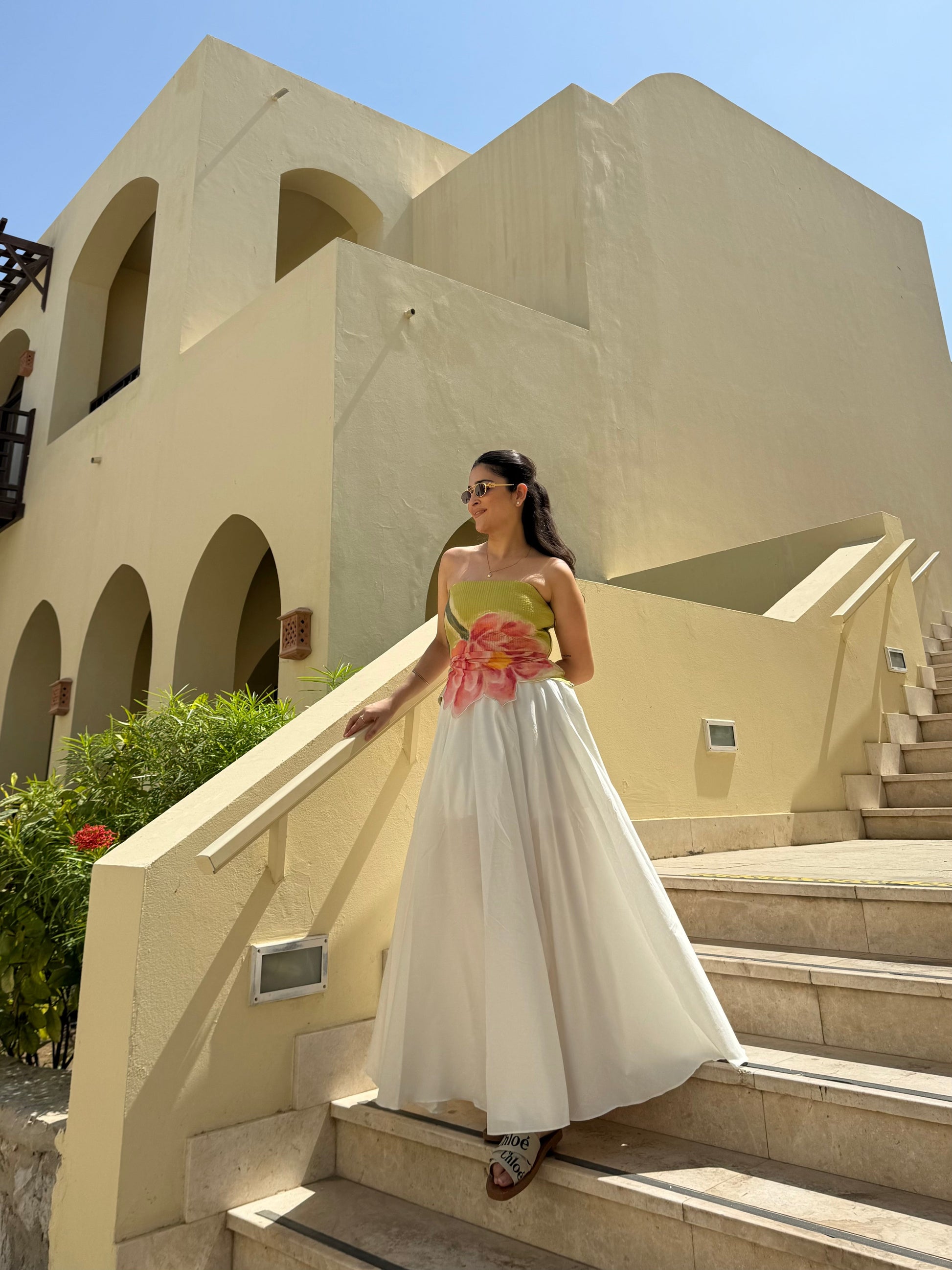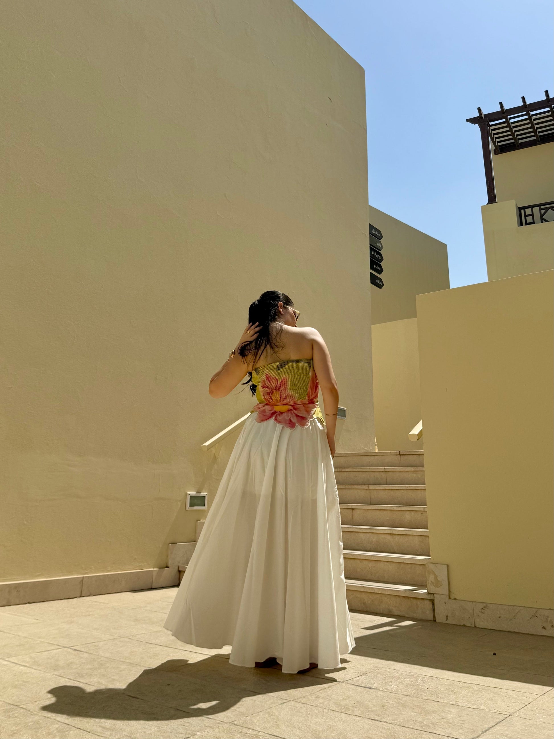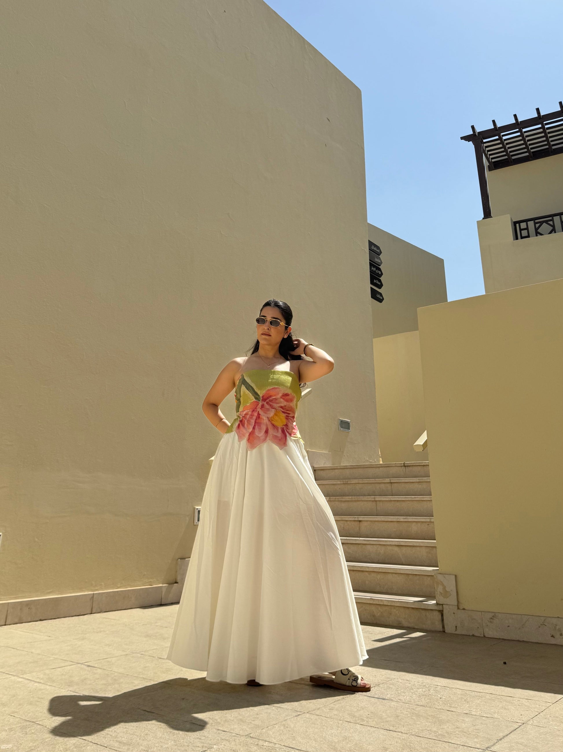 This two-piece set is all about effortless elegance with a modern twist. The corset is crafted from vibrant printed cotton, detailed with delicate cutwork at the hem for a subtle, feminine touch. Its structured shape is enhanced by stylish quilted stitching, giving you a flattering fit that holds its form beautifully. The long skirt flows with a full flare, creating a graceful silhouette that moves with every step. Together, they make a perfect combo for occasions where you want to feel confident, chic, and effortlessly put together.