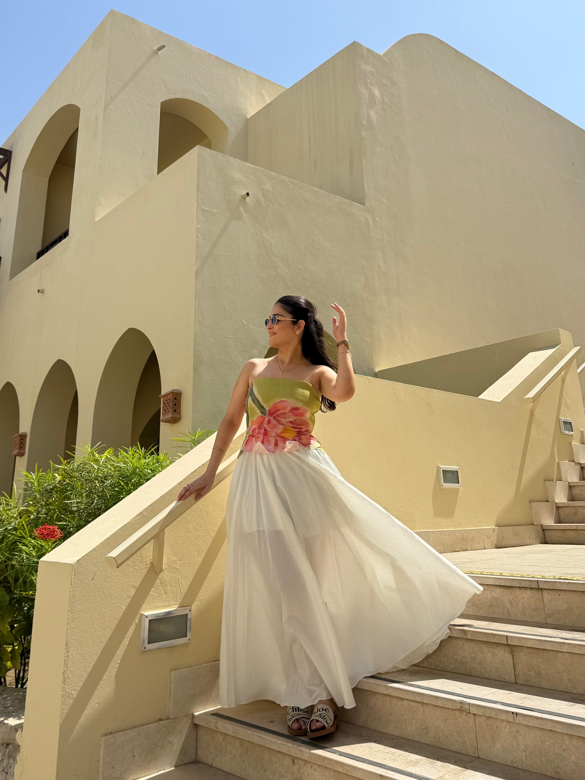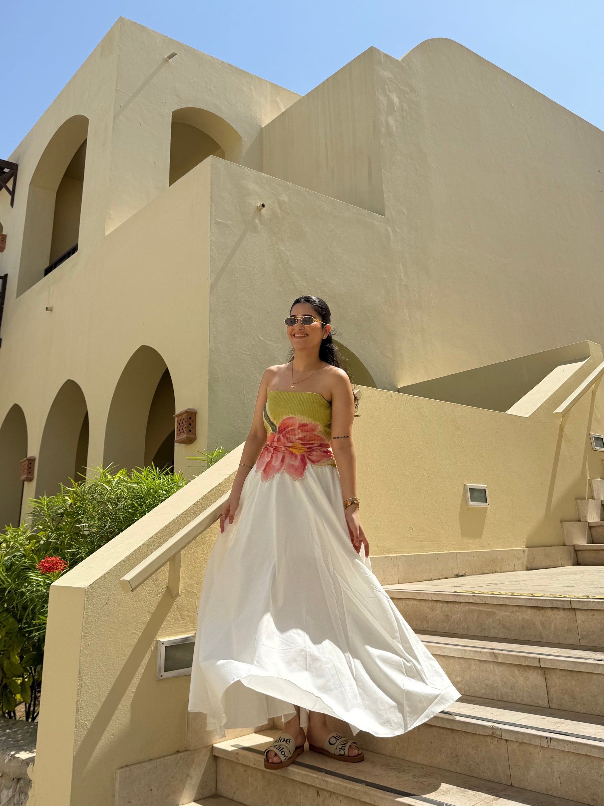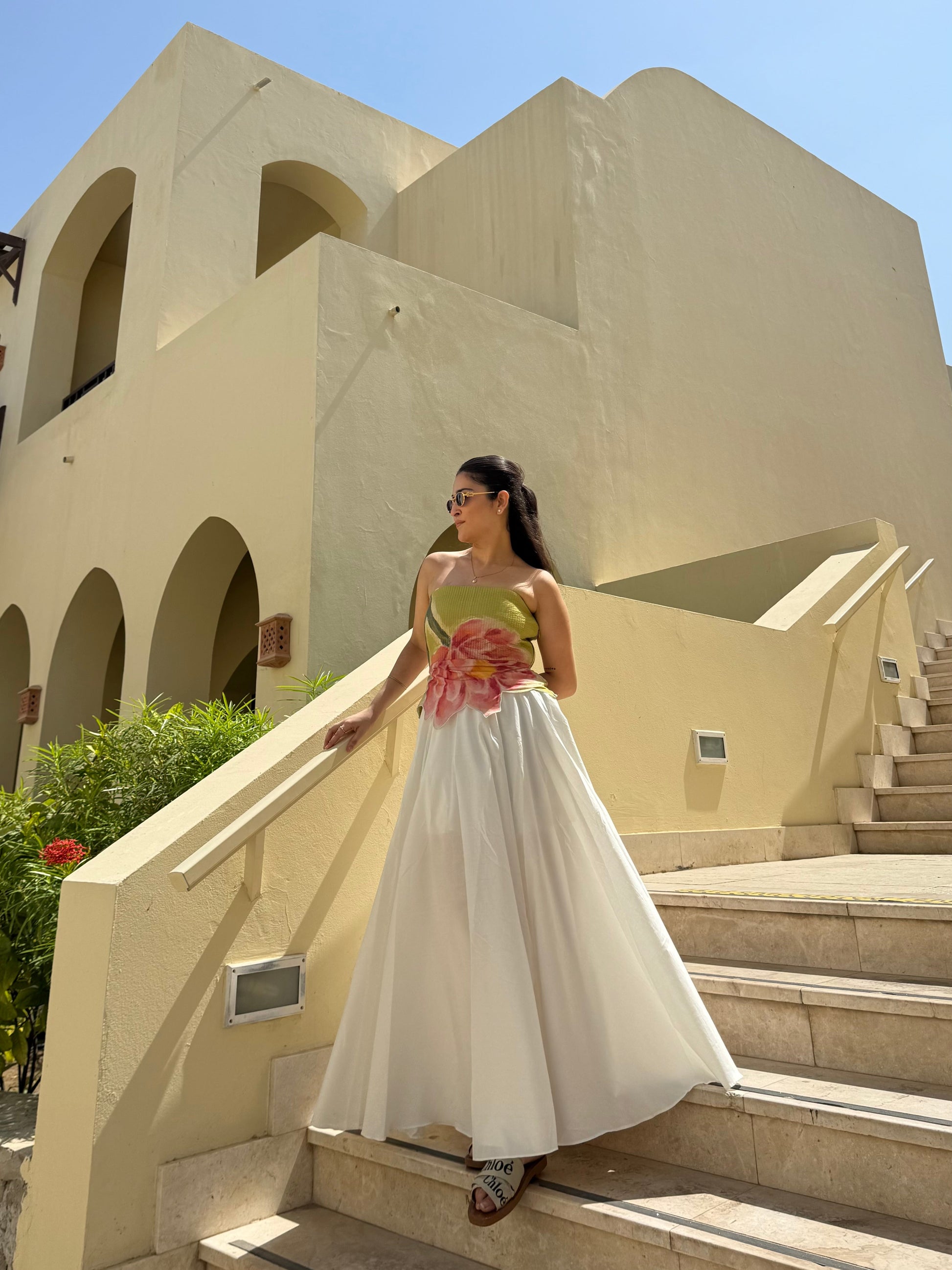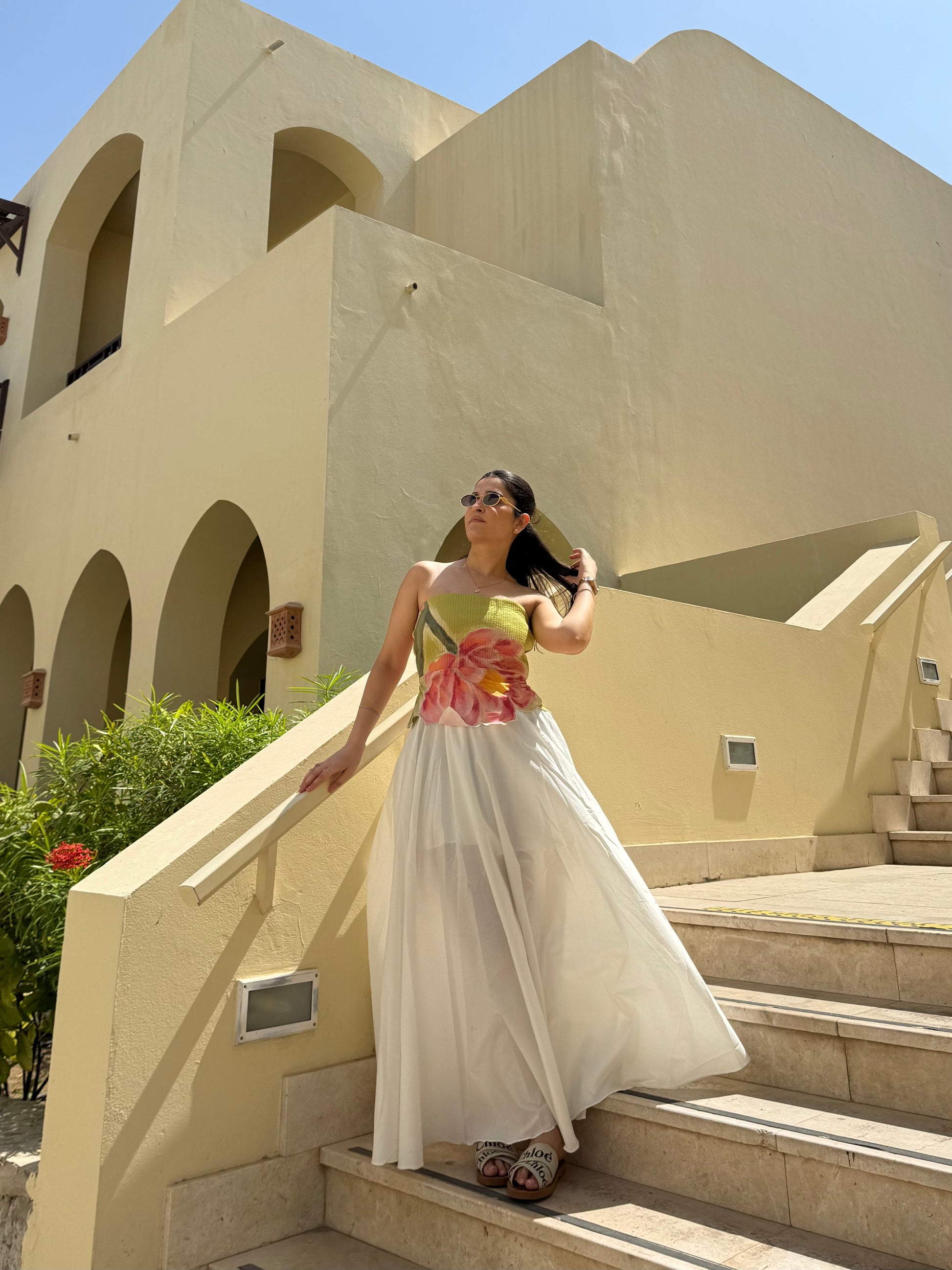 This two-piece set is all about effortless elegance with a modern twist. The corset is crafted from vibrant printed cotton, detailed with delicate cutwork at the hem for a subtle, feminine touch. Its structured shape is enhanced by stylish quilted stitching, giving you a flattering fit that holds its form beautifully. The long skirt flows with a full flare, creating a graceful silhouette that moves with every step. Together, they make a perfect combo for occasions where you want to feel confident, chic, and effortlessly put together.