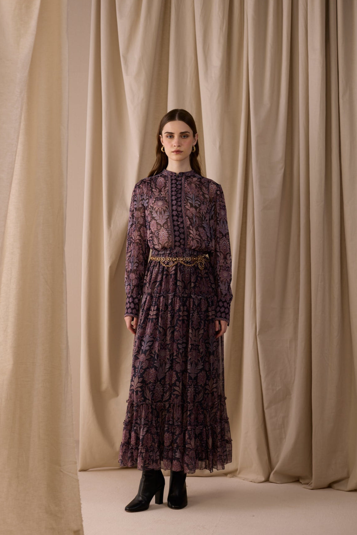 The Carmine Skirt is a dreamy maxi-length piece crafted in viscose chiffon, featuring a romantic purple botanical print. The tiered silhouette flows beautifully with every step, while the all-round elasticated waist ensures comfort without compromising style. Fully lined for ease, this skirt is a versatile standout—perfect for both relaxed days and elevated evenings.