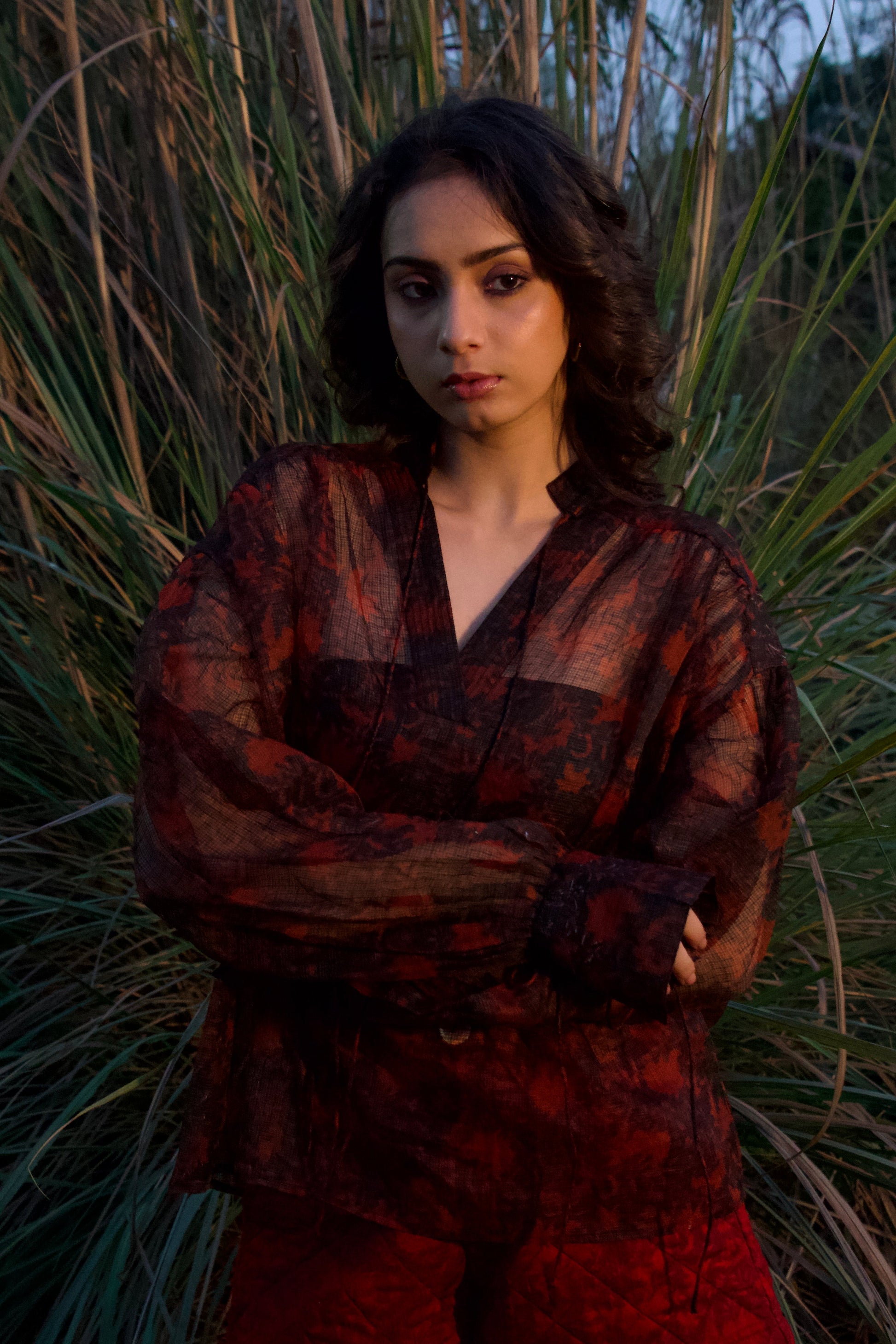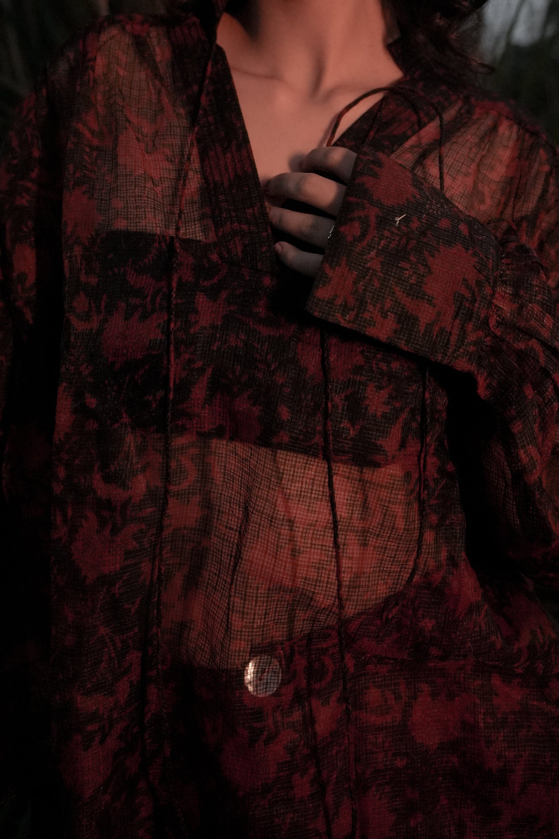 In this black iteration, the Koi Sheer Top feels like a veil of shadows and light. Crafted in pure Kota Doria, its surface carries a dark, tonal motif that shifts subtly with movement, while the sheer, airy weave keeps the piece visually weightless. Relaxed shoulders and long, flowing sleeves create an easy, fluid shape that can be worn loose or half-tucked, adding mood, depth, and quiet texture to any look.