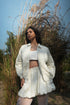 The Plume Balloon Skirt in ivory is all lightness and lift — a mini that floats just away from the body while keeping a clean, tailored waist. Soft gathers fall from the waistband into a rounded, cloud-like hem, its tonal floral surface adds quiet texture, making it an easy statement piece for dressing up or down.