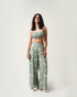 These wide-leg pants offer a seamless fusion of comfort and elegance. Crafted from airy, lightweight fabric, they drape beautifully, allowing for effortless movement. The relaxed fit is complemented by an elastic waistband at the back, ensuring both style and ease. A subtle floral print enhances their refined aesthetic, making them the perfect match for the coordinating shirt or a versatile standalone piece.