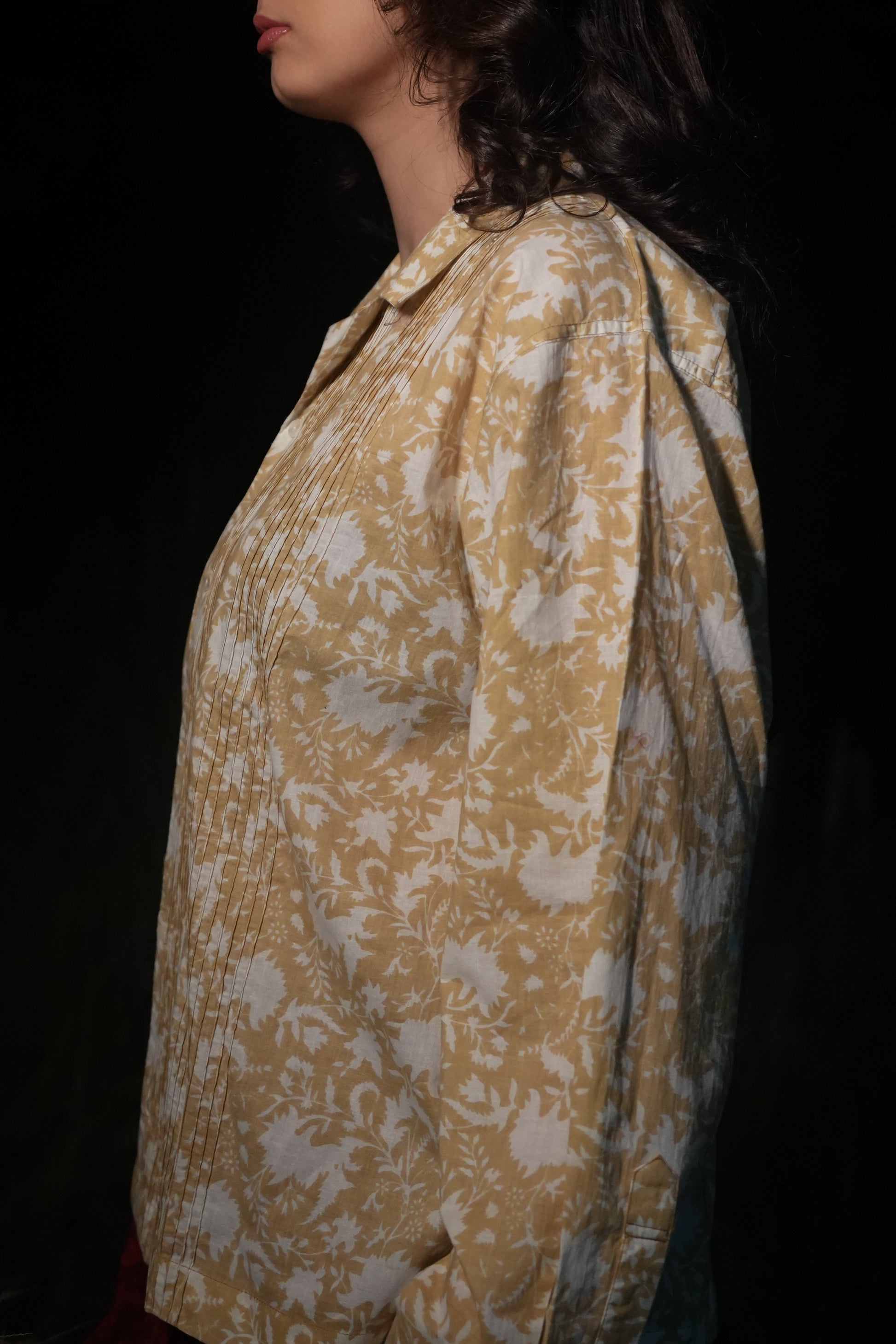 Light, airy, and quietly detailed, the Kira Cuban Collar Shirt is designed for everyday dressing with a considered twist. The open collar frames the neckline, while vertical pintucks through the front create a lengthening effect against the fluid fall of the beige printed fabric. Button it up for a polished look or leave it slightly undone for a more undone, off-duty mood.