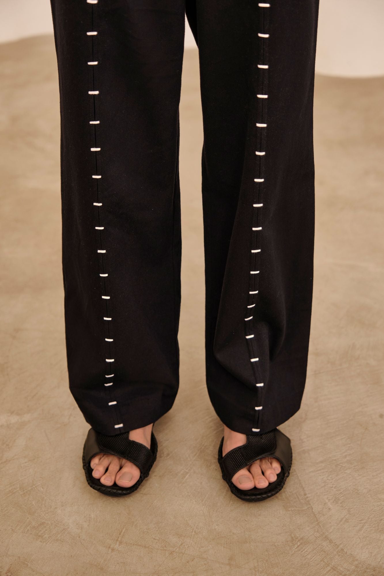 regular waist - front fly closure - contrast hand embroidery detail - front side pockets - back patch pockets - semi-relaxed fit
