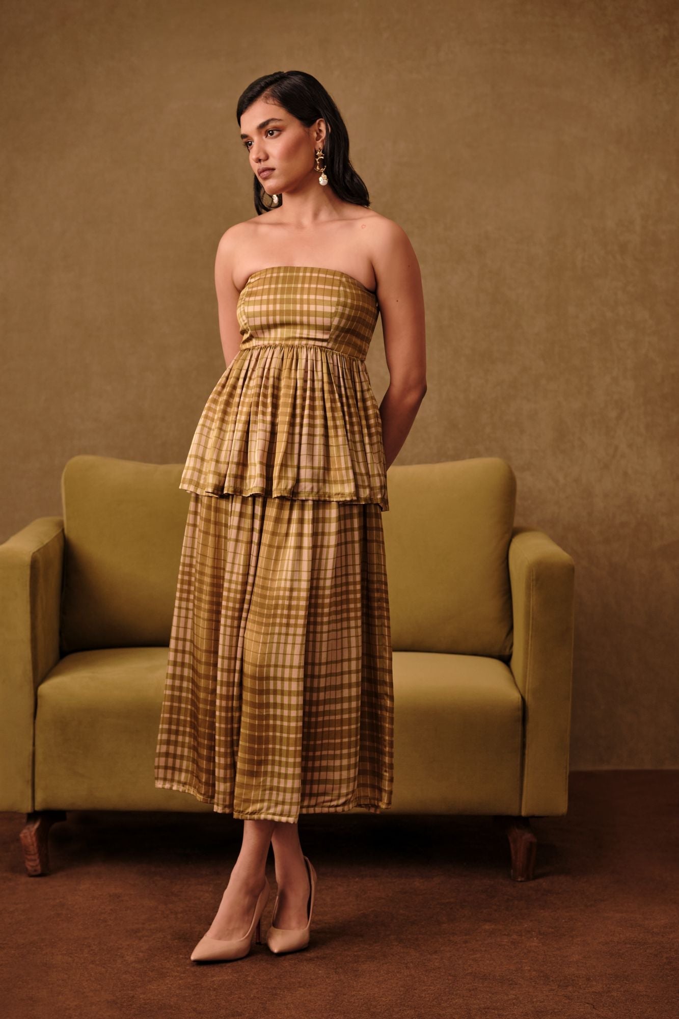 fitted bodice - gathered flare at waist - side conceal zip closure - back centre slit detail - digital printed checks