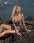 Make a statement with our super versatile top and our elegant bottom. The tie at the top and the asymmetric ring on the bottom orchestrate a high bar of elegance. With the collection's signature print- Mayan Jungle, on one side, this pair is highly versatile and reversible with lurex black on the other side.The bikini set is made from the finest, soft, and recycled fabrics, making it an innovative and environmentally friendly addition to any swimwear collection.