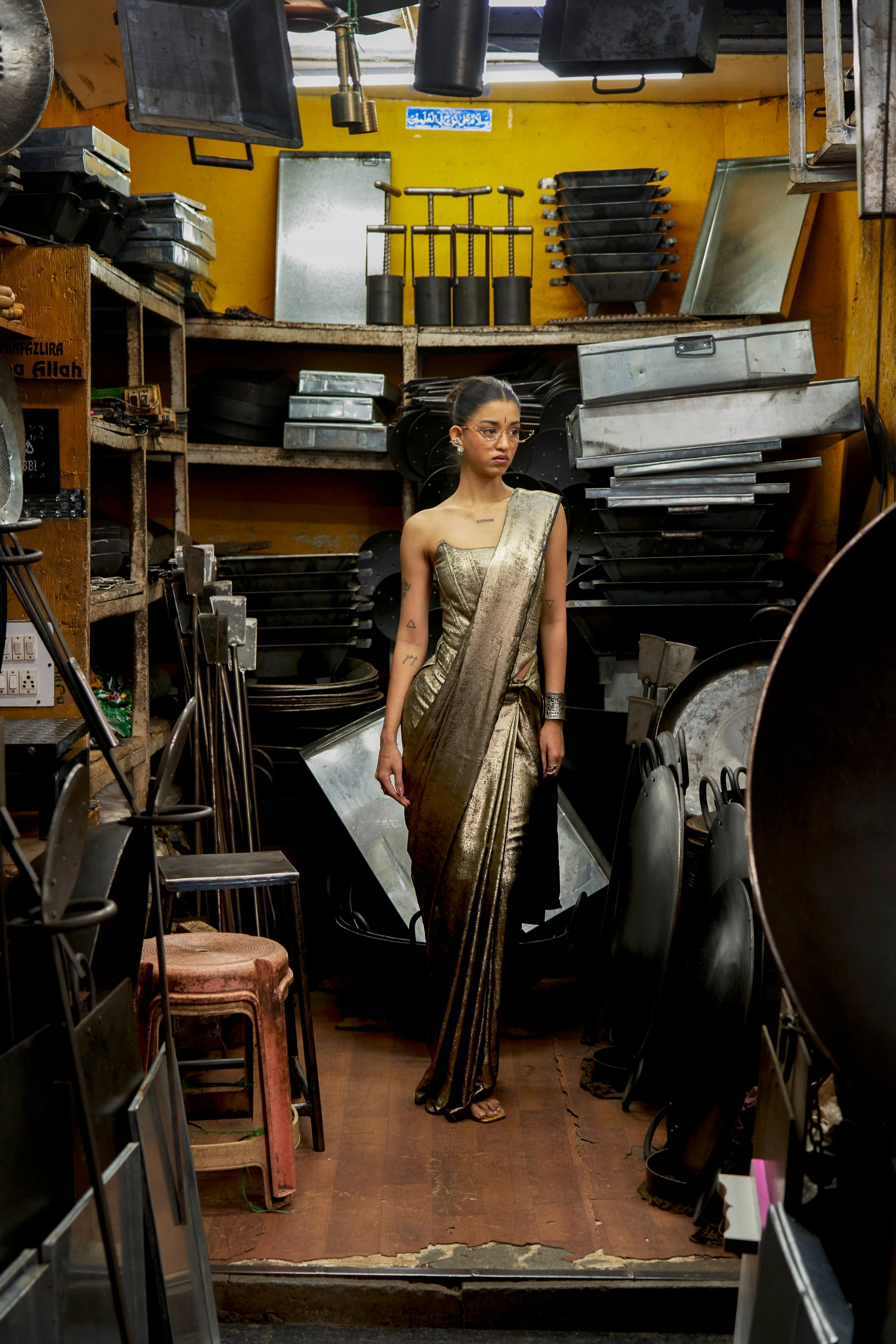 Make a statement with our stunning Antique gold Shimmer Saree, designed to shine beautifully with every step you take. The antique gold tone paired with its subtle shimmer creates a luminous effect that catches the light effortlessly, giving you a truly surreal glow as you walk.