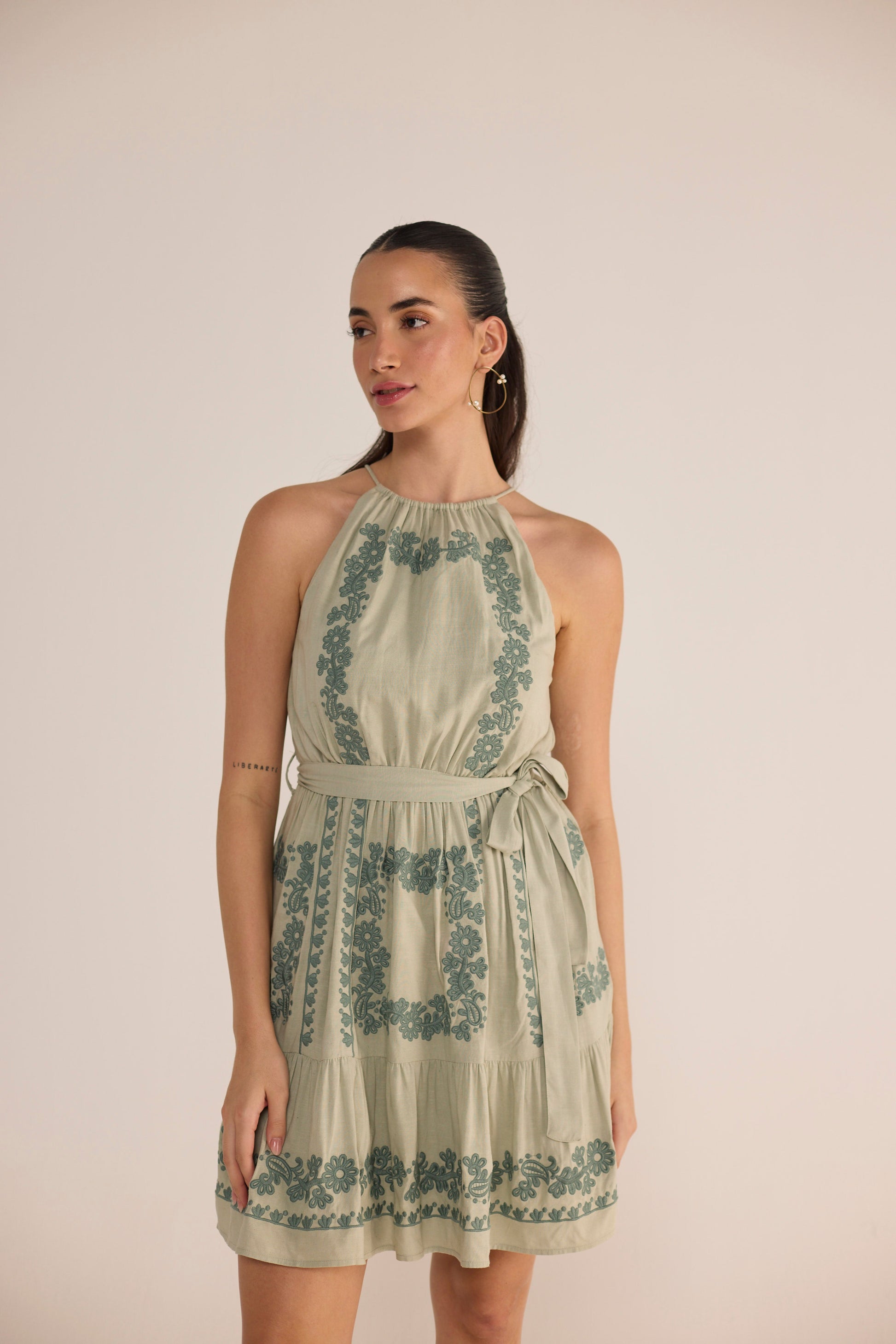 This sleeveless mini dress showcases symmetrical embroidery throughout, creating a unique and cohesive look. It features a stylish tie around the neck and a belt at the waist, adding a flattering silhouette to the vibrant design.