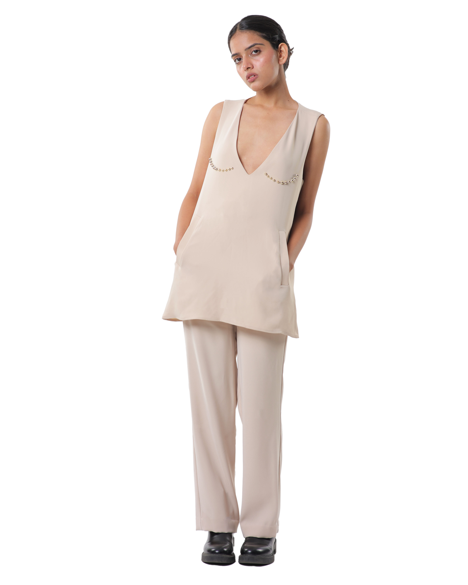 A versatile sleeveless A-line top that doubles as a dress or pairs effortlessly with pants or skirts. Adorned with delicate gold bead detailing around the chest, it features functional front pockets for added ease. Crafted from water-resistant and wrinkle-free fabric, it offers both style and practicality. Style it your way – as a standalone dress or layered for a contemporary look.