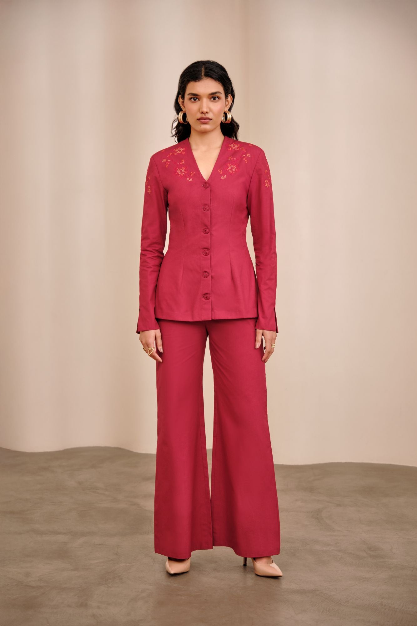 Designed to shape your frame and elevate your outfit with a single layer. The delicate shoulder embroidery adds the perfect touch of soft charm. Wear it to work, a dinner, or a date it’s elegance without effort.