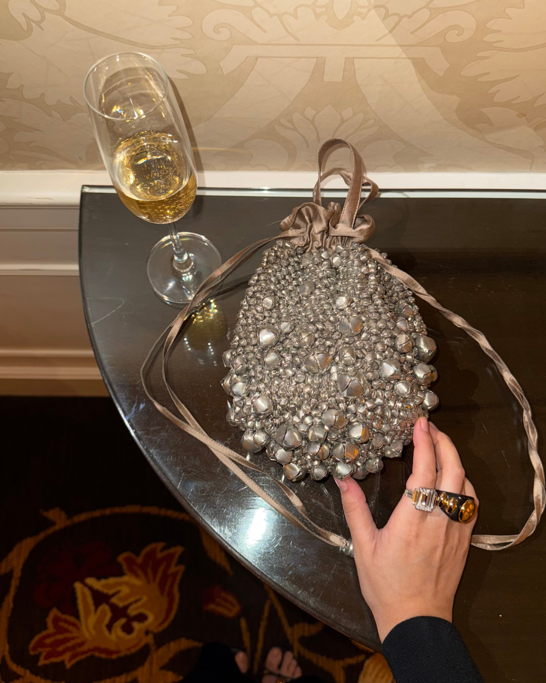 The Jhoom Rocky Bucket Bag is fashioned in nude taffeta, hand-embellished with hundreds of silver ghungroo of varying sizes to create a beautiful, undulating texture. It’s dramatic and dreamy and all consuming.