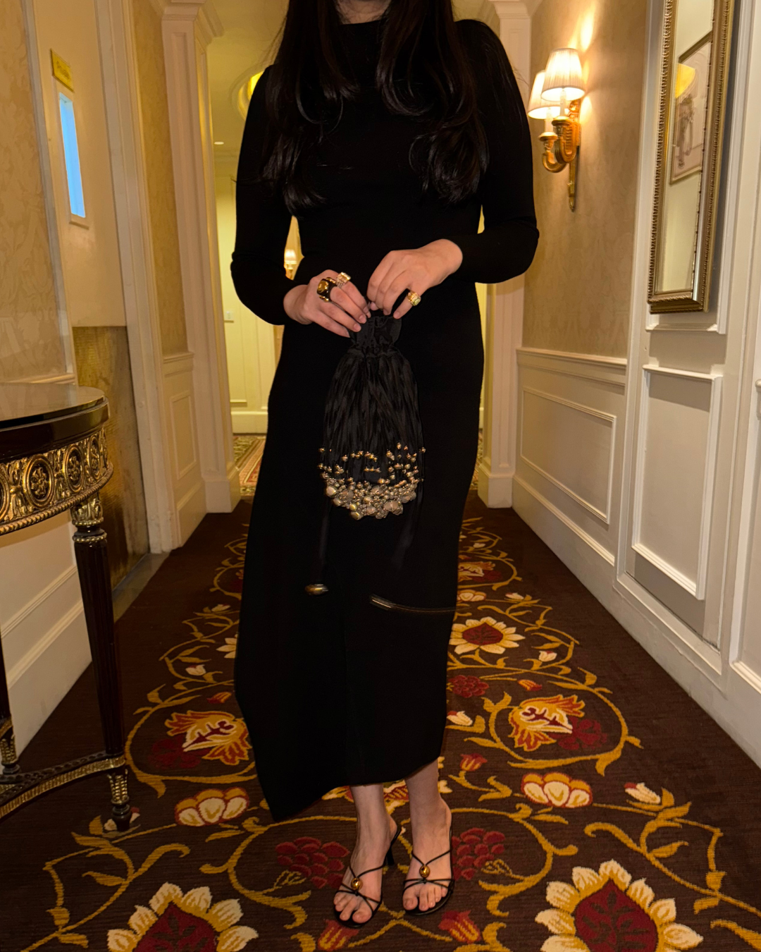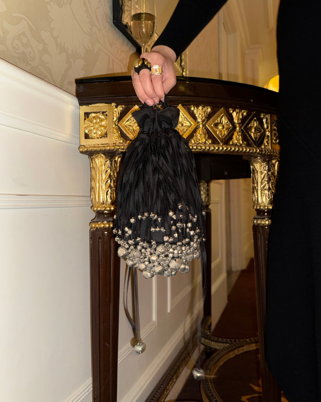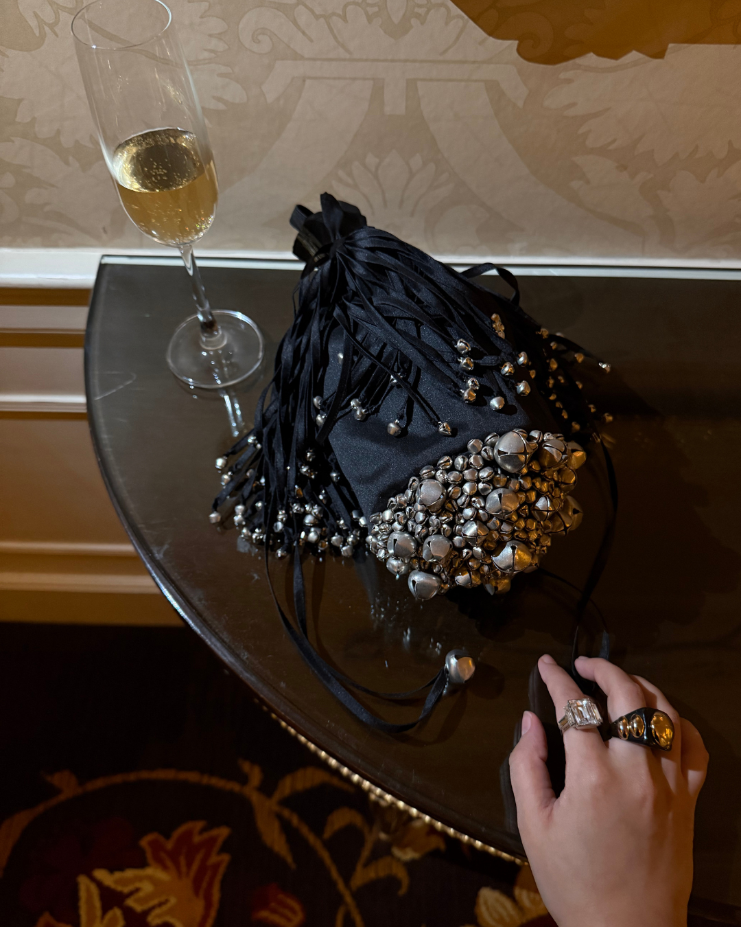 The Lennon Rocky Bucket Bag is fashioned in black taffeta. The synchrony of the many silver ghungroo that deck its concave bottom, and the black taffeta fringes with ghungroo endings - creates an irresistibly fun experience every-time you wear it.