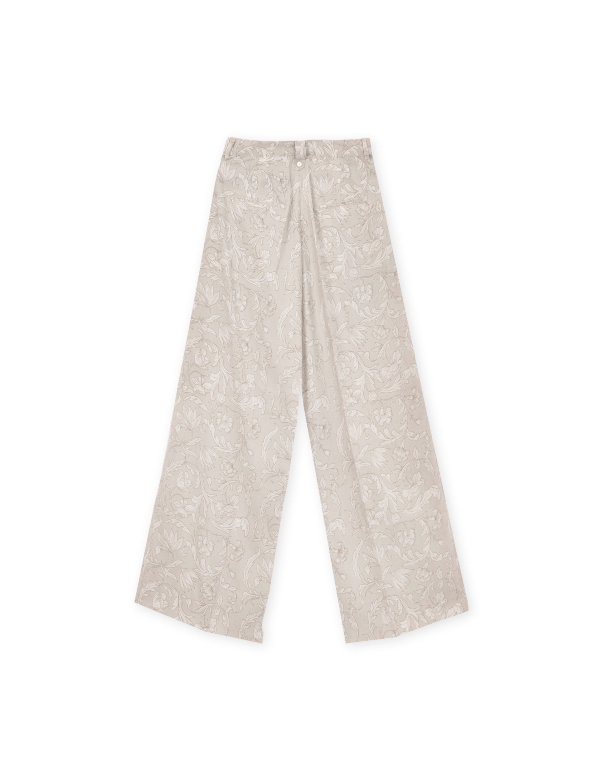 These wide-leg pants offer a seamless fusion of comfort and elegance. Crafted from airy, lightweight fabric, they drape beautifully, allowing for effortless movement. The relaxed fit is complemented by an elastic waistband at the back, ensuring both style and ease. A subtle floral pattern enhances their refined aesthetic, making them the perfect match for the coordinating shirt or a versatile standalone piece.