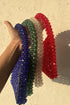 One of the classic shapes, Rosa, is made using translucent crystals. Carefully and lovingly handwoven using the finest acrylic crystals that catch the light imparting an ethereal dream like quality coupled with deep jewel toned hues make it a statement piece and an arm candy perfect for a night out and special occasions.