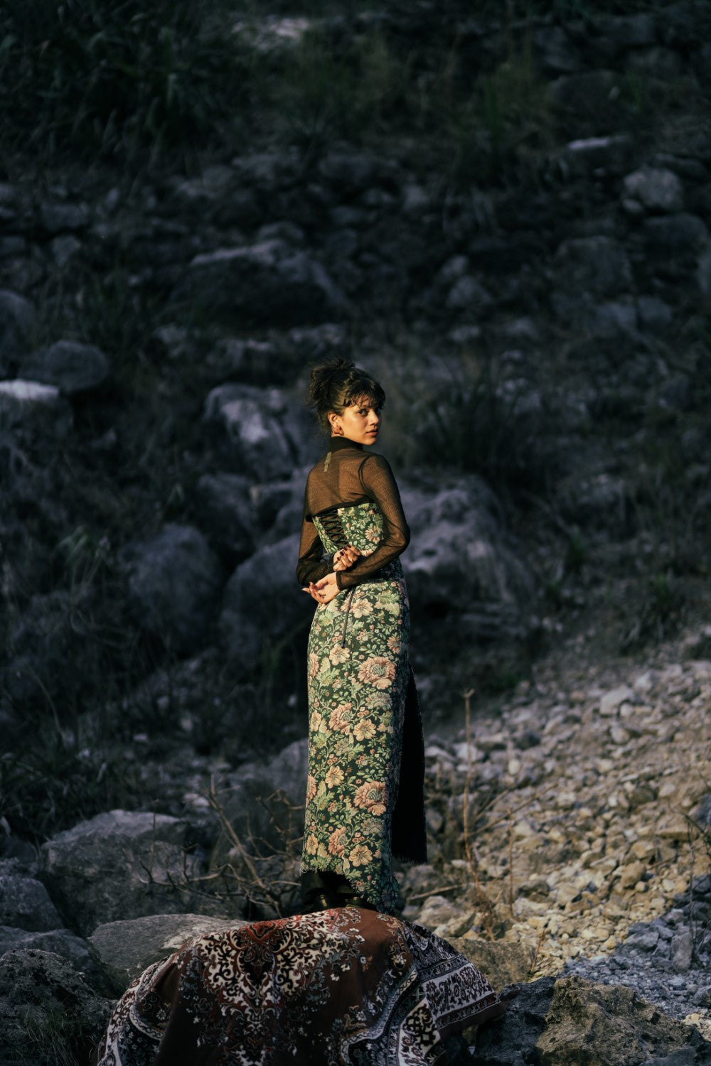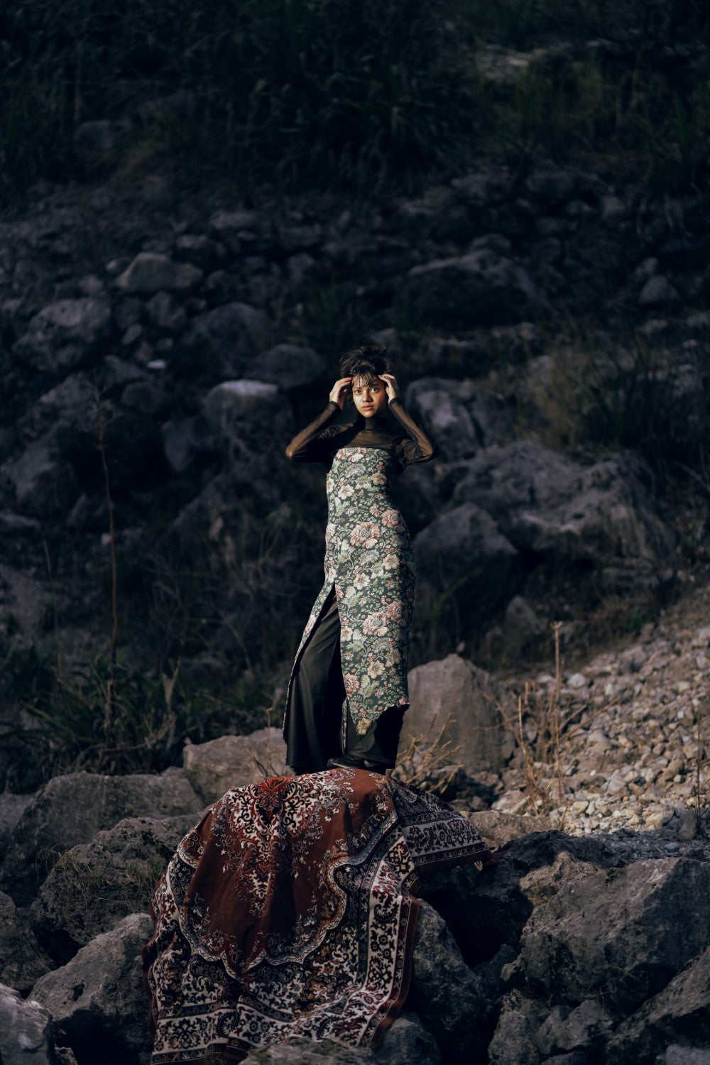 The Sofa Dress makes a dramatic statement with its tube silhouette crafted from floral jacquard upholstery fabric. This vintage-inspired piece features raw hem detailing, a high slit, and dual closures (back tie-up + side zipper) for an edgy, deconstructed look that blends home decor elegance with streetwear attitude.