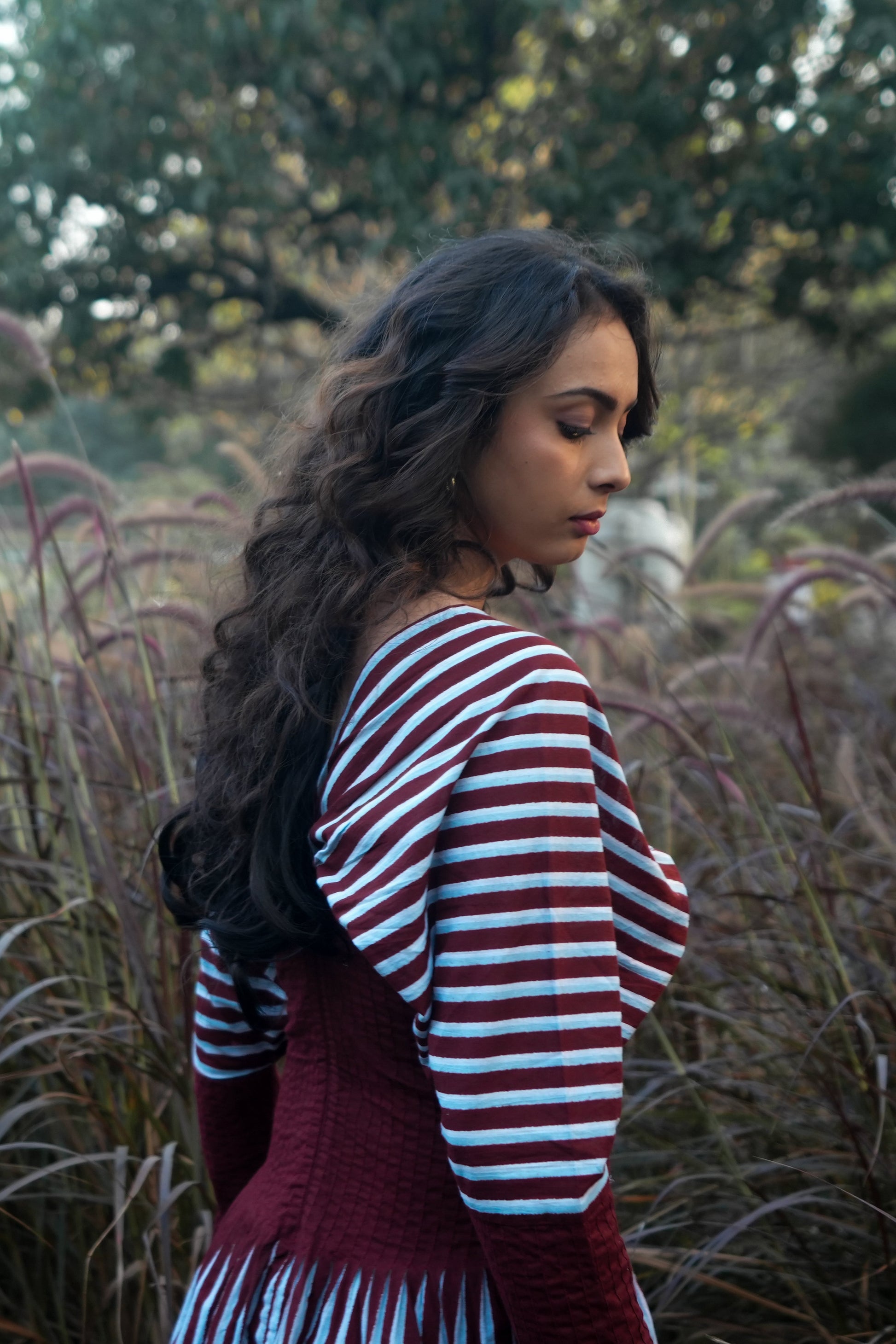 The Sunset Dress is a burst of joy wrapped in soft textures and vivid, horizon-inspired tones. With red and sky-blue stripes, it captures the glow of a day fading into colour. The pleated bodice offers a flattering, feminine structure, while the ruffled hem and sleeves bring a sense of movement and whimsy. Made for lingering evenings and spontaneous moments, it’s a dress that doesn’t just catch the light—it moves with it.